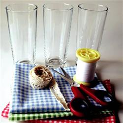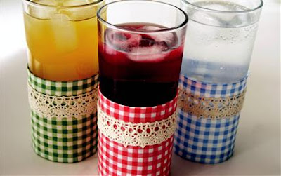 Bardaklarınızın ölçüsüne göre kumaşlarınızı 1 cm daha fazla pay bırakarak kesin. Kenarlarını içe kıvırıp dikin ve dantel veya fistoyu yerleştirip, onu da üzerine dikin. Kumaşı ister yapışkan bantlar dikerek, ister düz dikerek birleştirin. Kumaşları bardaklara geçirin. Böylece soğuk içeceği rahatlıkla üşümeden tutabilirsiniz.