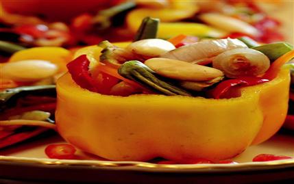 Biberlerin sap kısımlarını kesin. Çekirdek yataklarını temizleyip közleyin. Kabak ve diğer sebzeleri de közledikten sonra, bademlerle birlikte biberlerin içine doldurup servis yapın