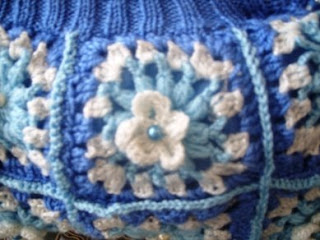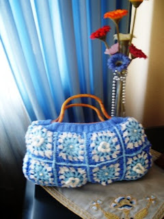 Üzerlerine bir motif aralıkla beyaz simli ipten küçük çiçekler ekledim. Ortalarında zıt renklerden boncuk koydum. En üstüne misinalı şişlerimi takarak 10 sıra 1*1 lastik ördüm.İçine de mavi renkli astar diktim. Saplarını taktım. Ve iç tarafa çantamı kapatmak için çıt çıt diktim. Güle güle kullanırız inşallah. Başka örme çantalarda buluşmak üzere…