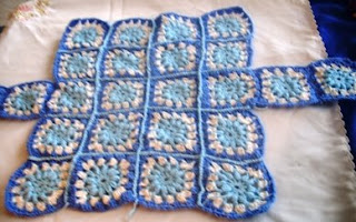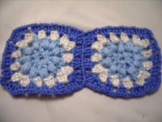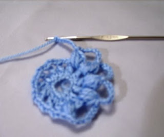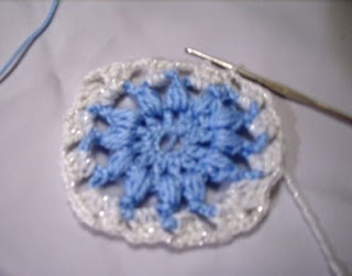 Ben Üç renk kullandım bu motifte .Öncelikle açık mavi ile 10 zincir çekiyoruz . Üzerine 12 tane 3’lü trabzan ile kutucuk yapıyoruz. Kutucukların arasına 2 zincir çekiyoruz. Şimdi tığımıza ipi dolaktıktan sonra tığımızı kutucukların içinden geçirip ipi tekrar doluyoruz. Bu işlemi7 kez yaptıktan sonra Üzerine 7 zincir çekip tekrar diğer kutucuğa batıyoruz. Bu şekilde tam bit tur atınca ben simli beyaz ipimle ,her( çektiğimiz 7 zincirden oluşan )köprüye 3 tane üçlü trabzan yaptım. 3 zincirle birleştirdim. Üzerini aynı şekilde koyu mavi iple döndüm. Bu şekilde 24 tane motif hazırladım ve diktim.