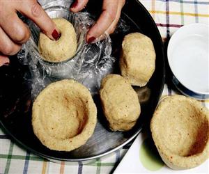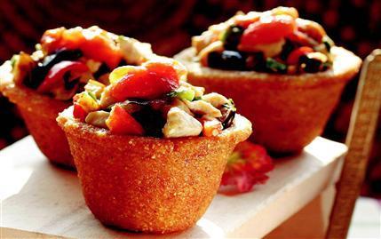 Bulguru tepsiye alıp üzerine tuz, karabiber ve toz kırmızıbiberi ilave edin. Bulguru ıslatacak kadar su ekleyip yoğurun. Haşlanmış patatesi rendeleyip bulgura ilave edin. Yumurtayı da ekleyip yoğurmaya devam edin. Unu katıp sakız kıvamına gelene kadar yoğurun. Üzerini nemli bezle örtüp dinlenmeye bırakın. Bulgurdan portakal büyüklüğünde parçalar koparın. Küçük yuvarlak bir kabın içini streç filmle kaplayın. Bulgur toplarını kabın içine yerleştirin. İşaret parmağınızla ortasından bastırıp kabın şeklini almasını sağlayın. Streç film yardımıyla bulgur çanağını kabın içinden çıkarın. Kızgın sıvıyağda kızartıp kenara alın. İç harcı için, tavuk göğüslerini ince doğrayıp yarım çorba kaşığı zeytinyağında pembeleşene kadar kavurun. Üzerine tuz, karabiber ve biberiye ilave edip ocaktan alın. Patlıcanı alacalı soyup küp doğrayın. 1 çorba kaşığı zeytinyağında kavurun. Biberleri doğrayıp yarım çorba kaşığı zeytinyağında soteleyin. Sarmısağı dövüp, kalan 1 çorba kaşığı zeytinyağında kavurun. Üzerine kıyılmış soğanı ilave edin. Küp doğranmış domatesi ekleyin. Sos suyunu çekene dek pişirin. Sosun yarıdan fazlasını bulgur çanaklarının üzerine gezdirmek için kenara ayırın. Kalan sosa tavuk, patlıcan ve biberleri ilave edip karıştırın. Karışımı sıcak bulgur çanaklarının içine pay edin. Üzerine, ayırdığınız sosu gezdirip servis yapın.