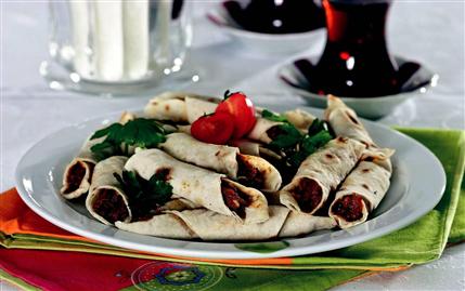 UNU bir kaba eleyip ortasını havuz şeklinde açın. Yarım su bardağı ılık suda yaş maya, tozşeker ve tuzu karıştırıp unun ortasına koyun. Yeterince su ekleyip yumuşak bir hamur elde edene kadar yoğurun. Üzerini nemli bir bezle örtüp 15 dakika dinlendirin. Hamurdan ceviz büyüklüğünde parçalar koparıp ince olacak şekilde açın. Sacda veya yapışmaz yüzeyli bir tavada arkalı önlü kızartın. Küçük sac ekmeklerini 4 parçaya bölün. Diğer tarafta haşlanmış eti elinizle didikleyin. Çemen, et, ceviz, salça ve sıvıyağı bir kasede karıştırın. Yufka ekmeklerinin uç kısmına iç harçtan koyup rulo şeklinde sarın ve servis tabağına dizin.