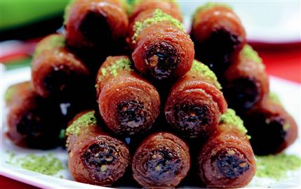 Öncelikle tüm iç malzemeyi iyice karıştırıp, bir kenara alın. Şerbeti için tozşeker ve suyu kaynatın. Limon suyunu ekleyip, iki taşım daha kaynatın ve soğumaya bırakın. Hamur için unu tezgahın üzerine eleyin ve ortasını havuz şeklinde açın. Ortasına margarin, yoğurt, irmik, maya, yumurta, rendelenmiş portakal kabuğu ve tuz ekleyin. Un hariç bütün malzemeyi karıştırın. Daha sonra kenarlardaki unu ortaya alın ve su ilavesiyle birlikte kulak memesi yumuşaklığında bir hamur elde edene kadar yoğurun. Hamurun üstünü nemli bir bezle örterek 15 dakika dinlendirin. Merdane yardımıyla hamuru 3 mm kalınlığında açın. Üzerine yumurta sarısı sürün. Hazırladığınız iç harçtan 1 parmak kalınlığında uzun şeritler yapın. 1 adet şeridi, açılmış hamurun kenarına koyup, rulo yapın ve kesin. İç harç ve hamur bitene kadar işleme devam edin. İç harçlı uzun hamurları baş parmak uzunluğunda kesin. Çok kızgın olmayan sıvıyağda önlü arkalı kızartın. Bir kevgir yardımıyla tatlıları yağdan alın ve soğuk şerbetin içine atın. 15 dakika şerbette beklettikten sonra servis tabağına alın. Antepfıstığı ile süsleyip, servis yapın.