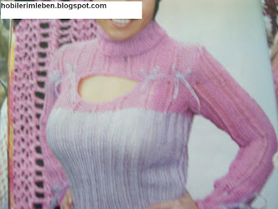 Ön ve arkaya lila renk ile 66 ilmekle başlayın.2 düz 2 ters 38 cm lastik örün.Üzerine pembe rengi geçerek 5 sıra ajur örün.Kolu 3-2-1 kesin.Ön ortasına gidiş ve dönüş sırasında 9 ilmek eksilterek pencere açın.Önün diğer tarafını da aynı şekilde örün.Her iki tarafta 9’ar ilmek eksilterek 8 sıra örün.Yarım daire şeklinde açıklık yapın.Ön ortasında kestiğiniz ilmek sayısı kadar ilmek atıp Roba kısmını örün daha sonra yaka omuzları kesin.Arkaya lastikten sonra pembe renk ile ajur örün.Kolu 3-2-1 kesin.Kollara 32 ilmekle başlayın 10 cm lastikten sonra ajurla devam edin.Kolun her iki tarafından eşit aralıklarla birer ilmek olmak üzere 6’şar ilmek artırın.Kolu 2-1-1 kesin. Her sırada birer ilmek eksilterek tamamlayın.Boyun çevresinden ilmek alıp 2 düz 2 ters 17 cm lastik örüp bitirin.