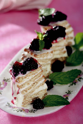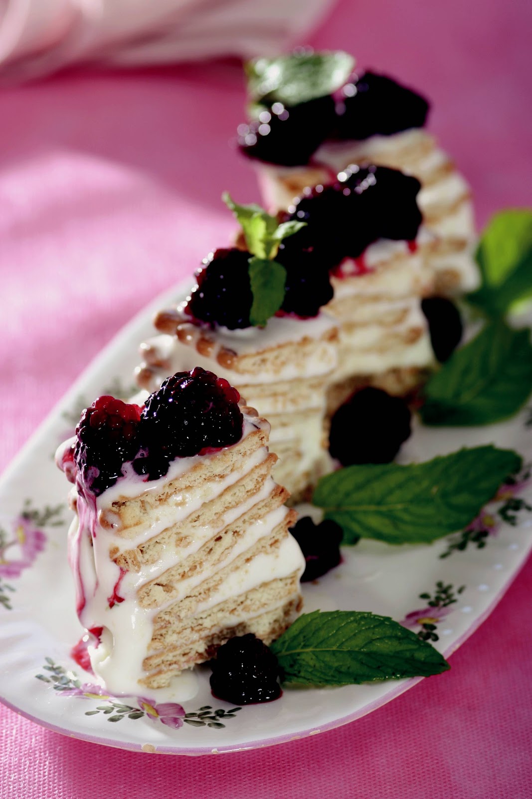 Bu şekilde arzunuza göre katlar oluşturun. En üstte dondurma olacak flekilde derin dondurucuda 1-2 saat bekletin. Dolaptan alıp böğürtlen ve nane yapraklı ile süsleyerek servis yapın.