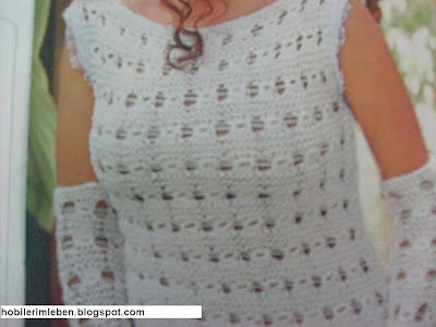 Ön ve arkaya 64 ilmekle başlayın.3 sıra haraşo örün.4 üncü sırada ilmeği haraşo örün.Diğer ilmekleri şişe iki defa dolayyarak devam edin.Son 2 ilmeği dolamadan haraşo örün.Arka sırada ilmeklerin ikisini haraşo ördükten sonra diğer 5 ilmekteki doladığınız ilmekleri boşaltarak sağ şişe alın,sonra tekrar sol şişteki son 5 inci ilmeğin içinden sağ şişe geçirip önce düz,sonra ters örün,düz,ters,düz ilmek alarak 5 ilmek çıkartın,(ilmekleri çıkartırken ipi öne ve arkaya alarak ).Tekrar sol şişteki 5 ilmekteki ilmekleri boşaltarak bir önceki işlemi yaparak devam edin.Son iki ilmeği haraşo örün.Arka sırayı yine haraşo ile ördükten sonra üzerine 3 sıra haraşodan sonra her ilmeğe 2 kez dolayıp örün.Kol kesimi yapmayın.Yakayı haraşodan sonra keserek kayık yaka yapın.Kollara 34 ilmekle başlayıp istediğiniz uzunlukta yapın.
