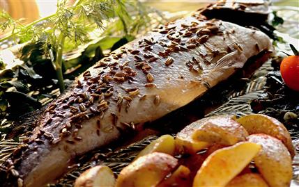 LEVREĞİ temizleyip yağlı kağıt serilmiş bir fırın tepsisine alın. Taze soğanları ince kıyıp geniş bir kaba koyun. Üzerine irice kıyılmış dereotu ve maydanoz ekleyin. Tereyağını küçük parçalar halinde karışıma ilave edin. Tuz ve rezenenin yarısını serpip karıştırın. Hazırladığınız harcı balığın karnına doldurun. Araya defne yaprağını koyun. Daha sonra üzerine sıvıyağı gezdirip kalan rezeneyi serpin. Patatesleri kabuklarını soymadan yıkayıp kuruladıktan sonra elma dilimi şeklinde doğrayın. Geniş bir kaba alıp üzerine sıvıyağ, toz kırmızıbiber, rezene ve tuz serpip harmanlayın. Patatesleri tepsiye, balığın etrafına yerleştirin. Önceden ısıtılmış 180 derece fırında 25-30 dakika pişirip servis yapın.
