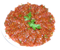 Yapılışı: Bütün malzemeler iyice yıkanır. Domatesler soyulduktan sonraufak ufak doğranır. Küçük kareler halinde doğranan soğanlar, tuz ve pul biber ile ovulur. Temizlenen biberler, maydanoz ve yeşil nane ince ince kıyılır. Bütün malzeme iyice karıştırıldıktan sonra üzerine yağ ve limon suyu gezdirilerek servis yapılır.