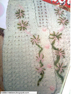 Önlere 30 ilmekle başlayın. 4 sıra haraşo örün. Ön ortasında ve yanlarda 5’er ilmeği haraşo, diğer ilmekleri ajur ile devam edin. Yirmi sekizinci sırada, kol oyuntusu için 10 ilmeği ve yaka oyuntusu için ön ortasında 9 ilmeği haraşo olarak 4 sıra örün. Daha sonra kol oyuntusunda 6 ilmeği kesin, ön ortasından da 9 ilmeği keserek ortadaki ilmekleri ajur ile devam edin. On beşinci sırada, omuzları keserek tamamlayın. Arkaya 44 ilmekle başlayın. 4 sıra haraşo örün. Yanlarda 5’er ilmeği haraşo olarak örün, diğer ilmekleri ajur olarak devam edin. Önde olduğu gibi kol oyuntusunu yaparak örüp omuzları kesin. Önlere çiçekleri işleyip yeleği tamamlayın.