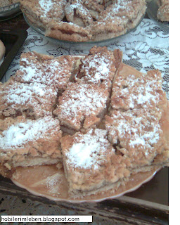 Hazırlanışı: Tüm malzemeler derin bir kabın içerisinde yoğrulur elde edilen yarı yumuşak yarı sert hamurun yarısı merdane ile unsuz açılarak yapacağımız tepsiye yerleştirilirelmaları rendeleyip şeker ve tarçınla karıştırıp pişirdiğimiz harcı açtığımız hamurun içine konularak heryerine gelecek şekilde konulur hamurun diğer kalan yarısı da aynı şekilde açılıp için üzerine konulur çatalla şekil verilir fırında yarım saat kadar pişirilip ılıdıktan sonra pudra şekeriyle servis edilir.