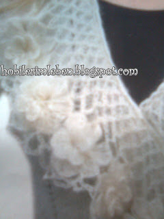 Arka sıraları ters örün. Kolun her iki tarafından eşit aralıklarla 1’er ilmek olmak üzere 5’er ilmek artırın. Kolu 2-1-1 kesin. Her sırada 1’er ilmek eksilterek tamamlayın.Önlerin her iki tarafına kuşak örüp bir yandan geçirerek arkada bağlayın.Yaka çevresine tığla önce katmerli çiçekleri yaparak çevresini zincir kafeslerle doldurup 12 cm. genişliğinde hazırladığınız parçayı dikin. Hırkanın etrafına ve kol ağzına 4 sıra zincir dantel yaparak bitirin.