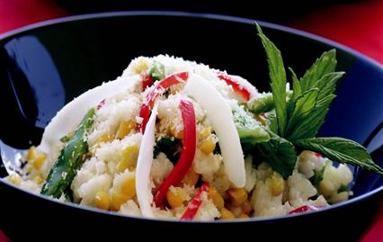 PİRİNCİ yumuşayana kadar haşlayın ve süzün. Ayıklanmış ve verev doğranmış taze fasulyeyi 10 dakika haşlayın. Suyunu süzdükten sonra zeytinyağında hafif kavurun. Üzerine jülyen doğranmış kırmızı biberi ekleyin. 1-2 dakika daha kavurduktan sonra haşlanmış pirinç, mısır ve hindistancevizini katın. Tuzunu ayarlayın. Tüm malzemeyi karıştırın ve servis tabağına alın. Üzerine hindistancevizi serpin. Dilim hindistancevizi ve nane yaprağı ile süsleyerek servis yapın