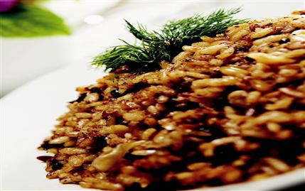 PİRİNCİ bol tuzlu kaynar suda 20 dakika bekletin ve süzün. Bir tencerede margarini eritin ve ayçiçekyağı ile karıştırın. Yağ kızınca fıstıkları pembeleştirin. Küp doğradığınız soğanı ekleyip kavurun. Tercih ettiğiniz ciğeri koyduktan sonra, kavurmaya devam edin. Yıkadığınız pirinci iyice süzdürün, kavurduğunuz malzemeye ilave edin. Tuzunu ve şekerini koyun. Ayıklayıp, suda bekletip, iyice süzdüğünüz üzümü ekleyin. 5 dakika daha çevirin. Su koyun. Kaynayınca altını kısın. Suyunu çekince karabiber ve yenibaharı ekleyin. Üzerini bir bezle kapatıp, ocağı kapatın. 15 dakika demlendirdikten sonra karıştırın ve servis yapın.