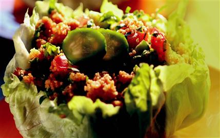 İNCE bulguru bir kaseye alın ve üzerini biraz geçecek kadar kaynar su döküp ağzını kapatın. Diğer yanda bir tavada yemeklik doğranmış soğanı sıvıyağda kavurun. Salçayı ilave edip kavurmaya devam edin. Çekirdeği çıkarılmış ve ince kıyılmış sivri biber, kabuğu soyulmuş ve küp doğranmış domatesi ekleyip 1-2 defa çevirip ocağın altını kapatın. Bu malzemeyi ince bulgurun içine katın ve karıştırın. İnce kıyılmış taze soğan, maydanoz, sarmısak, nar ekşisi, limon suyu, tuz, karabiber ve kimyonu ilave edip bütün malzemeyi elinizle yoğurun. Servis tabağına alın.