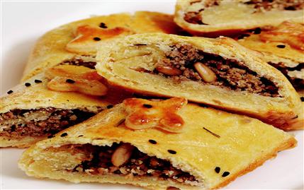 İRMİK hamuru için, çukur bir kaba irmiği alın ve üzerine tuz serpiştirin. Ilık suyu ekleyip, karıştırın. Birkaç dakika bekletin. Eritilip ılınmış margarini ekleyin. Karıştırıp, birkaç dakika yoğurun. Kulak memesi yumuşaklığında bir hamur elde edin. Hamurun üzerini örtüp, kenarda 10 dakika bekletin. Kıymayı çukur bir tencereye alın. Yağı ekleyip karıştırın. Kısık ateşte, kıyma suyunu çekene kadar pişirin. Daha sonra zar şeklinde doğranmış soğanı ekleyin. Tuz, karabiber ve pulbiber serpiştirin. Kıymayı ocaktan alın. Dolmalık fıstıkları, yapışmaz yüzeyli tavada ve kısık ateşte sürekli karıştırarak pembeleşene kadar kavurun. Kıymaya ilave edip, soğuyana kadar bekletin. İrmik hamurunu tekrar 2 dakika yoğurun ve iki parçaya ayırın. Merdane ile açarak, defter yaprağı büyüklüğüne getirin. Hamurun uzun kenarına kıymanın yarısını uzunlamasına yerleştirin. Hamuru sararak rulo şekline getirin. Üzerine fırça ile yumurta sarısı sürün. İkinci hamuru da aynı şekilde hazırlayıp, yağlanmış fırın tepsisine sıralayın. 180 derece fırında 20-25 dakika pişirip, dilimleyerek servis yapın.