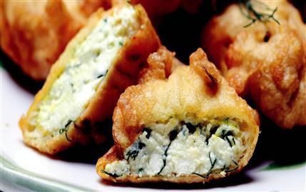 Harç malzemesini karıştırıp, suya batırıp çıkardığınız kabak çiçeklerinin içlerine doldurun. Ayrı bir yerde soda, yumurta, su, dereotu, tuz, karabiber ve unu, yoğurt kıvamı alana dek karıştırın. Kabak çiçeklerini bu karışıma batırıp çıkarın. Zeytinyağında kızartıp, kağıt havlu üzerine çıkarın. Fazla yağını bıraktığında soğuk olarak servis yapın.