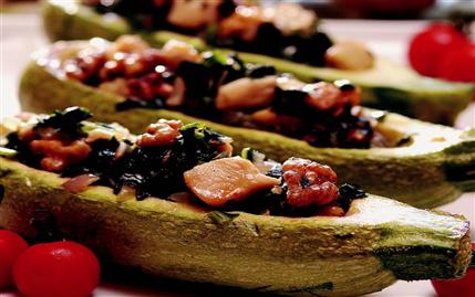Kabakları yıkayıp üst kısımlarını yarım cm kalınlığında boydan boya kesin. Kabak oyacağı ile içlerini çıkarın. Sıvıyağda hafifçe kızartıp içlerini tuzlayın ve kenara alın. Diğer taraftan 3 çorba kaşığı sıvıyağı bir tavaya alıp yemeklik doğranmış soğanı rengi dönene kadar kavurun. Üzerine tavuğu ilave edin. Tavuk kavrulunca, ince kıyılmış ıspanağı tencereye ekleyin. Tuz, karabiber ve pulbiber ilave edin. Ispanak yumuşayınca ocaktan alın. Üzerine ceviz ekleyip karıştırın. Hazırladığınız harcı kabaklara paylaştırın. Daha sonra yağlı kağıt serilmiş bir fırın tepsisine yerleştirin. Önceden ısıtılmış 180 derece fırında üzeri hafifçe kızarana kadar pişirip servis yapın.