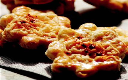 Yumurtanın sarısı ile akını ayırın. 2 su bardağı unu bir kaba eleyin. Ortasını havuz gibi açıp oda sıcaklığında beklemiş margarin, tuz, yarım su bardağı rendelenmiş kaşar peynirini, yumurta akı ve pulbiberin yarısını ekleyip yoğurun. Hamurun üzerini ıslak bir bez ile örtüp 10 dakika dinlendirin. Daha sonra merdaneyle bir parmak kalınlığında açın. Çiçek şeklindeki kalıplarla kesin. Bisküvileri yağlanmış fırın tepsisine dizin. Üzerine yumurta sarısı sürün. Kalan rendelenmiş kaşar peynirini ve pulbiberi bisküvilerin üzerine serpiştirin. Önceden ısıtılmış 170 derece fırında 20-25 dakika pişirin. Ilındıktan sonra servis yapın.