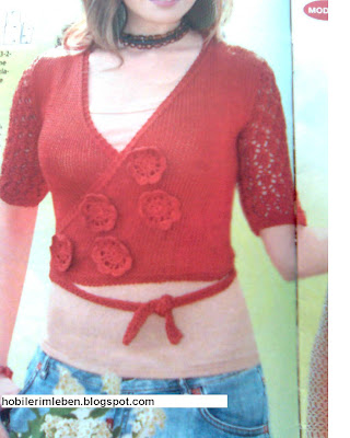Kollara 52 ilmekle başlayın 3 sıra haraşonun üzerine ajurla devam edin. Kolu 3-2-1 kesin. Her sırada 1’er ilmek eksilterek tamamlayın. Önlerin iki ucuna 2 sıra haraşo kuşak örüp çapraz olarak bağlayın. Tığ ile çiçekler örerek dikin.