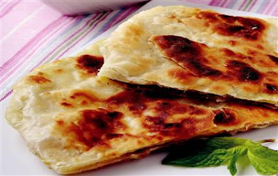 HAMURU için malzemeyi geniş bir kaba alıp, kulak memesi kıvamına gelene dek yoğurun. Üzerini örtüp 30 dakika dinlendirin. İç harcı hazırlamak için, tüm harç malzemesini yoğurup kenara alın. Sos için, geniş bir kaba sıra ile malzemeyi alıp iyice karıştırın. Dinlenen hamuru 4 eşit bezeye ayırın. Birinci bezeyi merdane ile servis tabağı büyüklüğünde açın. İç harçtan bir parça alıp, hamurun yarısına yayarak yerleştirin. Hamurun diğer kenarını harcın üzerine kapatıp, yarım ay şekli verin. Merdane ile hamurun üzerinden bir kez daha geçin. Diğer bezelere de aynı işlemi uygulayın. Kızgın sıvıyağda önlü arkalı kızartın. Sıcak olarak sosla birlikte servis yapın.