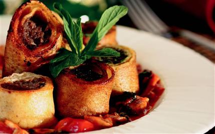 2.Kıyma, kıyılmış soğan, sarmısak, antepfıstığı, ufalanmış ekmek, kaşar peyniri, karabiber, kimyon, fesleğen ve tuzu derin bir kaba alarak yoğurun. Küçük parçalar koparıp, yuvarlayarak uzun köfteler yapın. Köfteleri kreplerin içine sararak yuvarlak kesin. Kızgın sıvıyağda kızartın. Fazla yağını salması için kağıt havlu üzerine çıkartın.