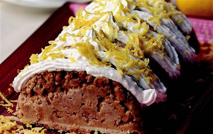 PUDİNGİ süt ve limon suyu ile pişirdikten sonra ocaktan indirmeye yakın limonun rendelenmiş kabuğunu ekleyin. Diğer tarafta bisküvileri blenderden geçirip erittiğiniz margarini ilave ederek karıştırın. Ardından pudingi de ekleyerek karıştırmaya devam edin. Uzun bir kalıbı yağlı kağıt veya folyo ile kaplayarak oluşan karışımı kalıba dökün. 3-4 saat buzlukta dinlendirin. Servis yapmadan yarım saat önce buzdolabının alt rafına indirin. Krem şanti ile süsleyerek, dilimleyip servis yapın