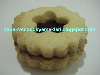 Yapılışı: Oda sıcaklığında, yumuşamış margarin ve diğer tüm malzemeler, yumuşak bir hamur olacak şekilde un katılarak yoğurulur. Temiz bir zemin üzerinde 0.5 cm. kalınlığında açılır ve büyükçe kalıpla şekil verilerek kesilir. Kesilen hamurların ortalarından daha küçük kalıplarla tekrar şekiller çıkarılır. Kurabiyeler yağlı kağıt serili tepsi üzerine dizilerek önceden ısıtılmış 170 dereceye ayarlı fırında kurabiyeler hafif renk değiştirmeye başlayana kadar pişirilir. Fırından çıkarılan kurabiyeler soğuduktan sonra, tepsiye oturan kısımları birbirine bakacak şekilde bir bütün+bir delikli kurabiye olmak üzere aralarına istediğiniz marmelattan sürerek kapatılır. Ben vişne marmeladı kullandım, hafif buruk tadıyla çok güzel oldu. Bu ölçülerden 16-17 adet kurabiye çıkarabilirsiniz.