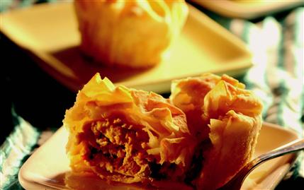 KABUKLARI soyulmuş domates ve sivri biberleri küp şeklinde doğrayın. Eritilmiş tereyağında sivri biberi kavurup üzerine domatesi ekleyin. Yumuşayınca çırpılmış yumurtayı ilave edin ve karıştırın. Kekik, tuz, karabiber ve pulbiber ekleyin. Ocaktan alıp ılınması için bir kenara kaldırın. Yufkaları üst üste koyun ve pasta tabağı büyüklüğünde parçalar kesin. Küçük muffin kalıplarını sıvıyağ ile yağlayıp, galeta unu ile unlayın. Kalıbın içine bir kat yufka koyup üzerine sıvıyağ sürün. İkinci yufkayı da serip yağlayın. Yufkaların ortasına soğumuş menemen harcından koyun. Kenarından sarkan yufkaları ortaya doğru toplayın ve üzerini sıvıyağ ile yağlayın. Diğer yufkalar ve menemen bitene kadar işleme devam edin. Kalıpları fırın tepsisine dizin. Önceden ısıtılmış 180 derece fırında 25-30 dakika pişirin. Börekler ılındıktan sonra kalıplardan çıkarıp servis yapın.