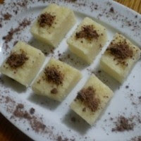 Hazırlanışı: Tencereye süt, irmik ve toz şekeri alın. Sürekli karıştırarak kıvamı koyulaşana kadar pişirin.Karışım kaynamaya başladıktan sonra tereyağını ilave edin.İyice karıştırdıktan sonra ocaktan indirin.Beyaz çikolatayı küçük parçalara bölüp tencereye ekleyin.Eriyene kadar karıştırın.Orta derinlikte cam bir tepsiyi hafif suyla ıslatın.Tatlıyı tepsinin içine dökün.Buzdolabında 1 saat beklettikten sonra karelere bölün.Bitter çikolatayı rendeleyip tatlının üzerini süsleyin.