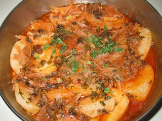 Bir tavada 2 kaşık margarini kızdırıp soğanlar hafif pembeleşinceye kadar kavurun ve üzerine kıymayı ilave edip suyunu salıp tekrar çekene kadar kavurun. Domatesleri ekleyin, hafif pişene kadar kavurup tuz ve karabiber ilave edin.