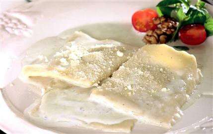 Hamuru için, un, yumurta, zeytinyağı ve tuzu 1-2 dakika mikserde karıştırın. Daha sonra iki parçaya ayırın. Parçalardan birini unlanmış tezgahta elinizin ayasını kullanarak 10 dakika iyice yoğurun. Diğer hamur parçasına da aynı işlemi uygulayın. İki parça hamuru birleştirin. 1-2 dakika yoğurduktan sonra top haline getirin. Hamurun nemini koruması için üzerini örtüp, 1 saat dinlendirin. Kartpostal inceliğine gelene dek merdaneyle açın. Açarken ara ara hamuru ve tezgahı unlayın. Hamuru tezgahın kenarından sallandırıp, düşmemesi için ucuna merdane yerleştirin ve 5-6 dakika bu şekilde kurutun. Harcı hazırlamak için tüm harç malzemesini iyice karıştırın. Kuruttuğunuz hamuru 20 cm eninde şeritler halinde kesin. Kestiğiniz şeritlerin yarısına, belirli aralıklarla cevizli harç yerleştirin. Diğer yarısını cevizli harcın üzerini örtecek şekilde kapatın. Hamur keseceği ile büyük kareler kesin. Kat yerlerinin açılmaması için yumurta akı sürün. Hazırladığınız raviolinin üzerine alüminyum folyo ile kapatıp buzdolabında 2 saat dinlendirin. Haşlamak için su, sıvıyağ ve tuzu kaynatın. Ravioliyi suya atıp 8-10 dakika haşlamaya bırakın. Sosu hazırlamak için, derin bir tencerede tereyağı ile kremayı eritin. Rokfor peynirini ilave edip karıştırın. Üzerine parmesan peynirini ekleyin. Haşlanan ravioliyi süzüp kaynayan sos tenceresine atın. Kısık ateşte 2-3 dakika pişirin. Servis tabaklarına aldığınız raviolinin üzerine parmesan peyniri serpip servis yapın.