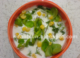 Yoğurt ve diğer malzemelerin hepsi karıştırılır, üzeri bir dal semiz otu, tereotu ve mısırla süslenir.