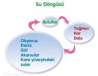 Yeryüzünde denizler, göller, ırmaklarda bulunan sular, Güneş’in etkisiyle buharlaşarak yükselerek bulutları oluşturur. Bulutlarda biriken su damlacıkları havanın sıcaklığına göre yağmur, kar ya da dolu olarak tekrar yeryüzüne dönüş yapar. Suyun değişik şekillerde yeryüzü ile atmosfer arasındaki bu dönüşümüne su döngüsü denir. Buharlaşan suyun yağmur olarak geri dönmesiyle doğada su dengesi oluşur. Mevsimlere ve iklime göre suyun buharlaşması ve yağışlarla geri dönmesi değişiklik gösterir. Su döngüsü konusunun daha iyi anlaşılması için maket ödevi hazırlanır. Bunun için öğrenciler oyun hamuru, fon kağıdı, renkli boyalar kullanarak maket hazırlar. Makette denizler, göller, akarsular boyalarla renklendirilir. Makette oklarla suyun akışı anlatılabilir. Aşağıdan yukarıya oklar suyun buharlaşmasını, yukarıdan aşağıya gelen oklar ise yağmurları göstererek su döngüsünü anlatmaktadır.