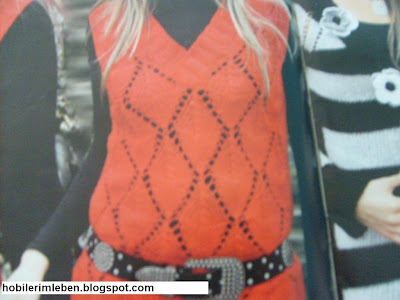Ön ve arkaya 56 ilmekle başlayın. 6 cm. 2 düz,2 ters lastik örün. Her iki yanda 2 ilmekten sonra ilmekleri ortalayarak yanlara yarım ajur olacak şekilde örneği kurun.Kolu 3-2-1 kesin. Yakayı V açın.Kol ve yaka çevresinden ilmek alıp 2düz, 2 ters lastik örerek tamamlayın.