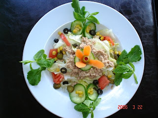 Soğanları soyup, yıkayın ve yarım ay şeklinde dilimleyin. Domatesleri kaynar suya atıp çıkarın, kabuklarını soyup dörde bölün. Çekirdeklerini çıkartıp ince ince dilimleyin. Maydanozun yapraklarını yıkayın, domates ve soğanlarla karıştırın. Göbek salatayı yıkayıp süzülmeye bırakın. Domatesli karışımla birlikte tabaklara paylaştırın. Limon suyu ve kabuğunu tuz, karabiber ve zeytinyağı ile karıştırın. Ton balığını süzüp iri parçalara ayırın, salataların üstüne koyun. Sos ve zeytinleri ekleyip servis yapın.