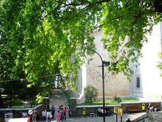 Camiye yemyeşil bir avludan geçerek giriyoruz. Sağ tarafımızda camii bütün görkemi ile yükselirken ,sol taraftaki avlu da alışveriş yorgunu ve namaz saatini bekleyen insanlar, bu güzelim avlunun tadını çıkarıyor. Köşeyi dönünce Yeşil caminin dış şadırvanı ve girişi bizi karşılıyor.