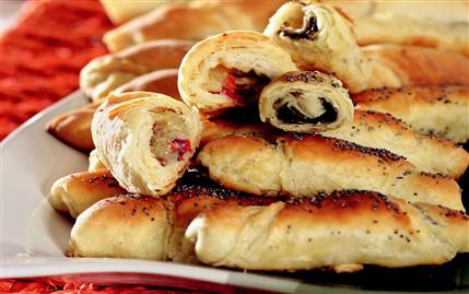 UN, süt, maya, tuz ve tozşekeri derin bir kaba alarak iyice yoğurun. Üzerini örterek, oda sıcaklığında 45 dakika dinlendirin. Mayalanan hamuru 10 parçaya ayırıp yarım saat buzdolabında bekletin. 5 adet hamuru merdane yardımıyla teker teker açın. Her katına 1 tatlı kaşığı eritilmiş margarin gezdirerek üst üste koyun. Kalan 5 adet hamura da aynı işlemi uygulayın. Elde ettiğiniz hamurları buzdolabında 15-20 dakika dinlendirin. Daha sonra merdaneyle çok ince şekilde yeniden açın. Her bir yufkayı 12 parçaya keserek kenara alın. Pastırmalı iç harcı hazırlamak için, pastırmayı ince şeritler halinde doğrayın, patatesleri haşlayarak ezin. Kırmızı biberi küp şeklinde doğrayın. Maydanozu kıyın. Daha sonra tüm bu malzemeleri, tuz ve karabiber ilave ederek karıştırın. 12 adet üçgen hamurun içine hazırladığınız pastırmalı harçtan koyarak sarın. Üzerine susam veya haşhaş tohumu serpin. Fırın tepsisini yağlayarak kruvasanları tepsiye dizin. Zeytinli iç harcı hazırlamak için zeytin ezmesini, küp kestiğiniz kırmızı biberi ve kıydığınız dereotunu karıştırın. Daha sonra kalan 12 adet üçgen hamurun içine yerleştirip sarın. Fırın tepsisindeki diğer kruvasanların yanına yerleştirin. Önceden ısıtılmış 170 derece fırında pişmeye bırakın. Üzerleri kızardığında fırından alın. Sıcak olarak servis yapın.